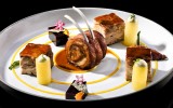 Cochinillo jugoso y crujiente, todo ello acompañado de membrillo de vino tinto especiado y manzanas rellenas de mousse de romero 18-05-2020