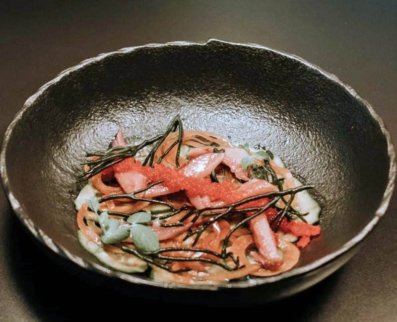 Emplatamos poniendo una capa de calabacín, otra de cebolla, sin su líquido. Encima colocamos las sardinas, las huevas de tobiko y acabamos con el codium. Con el dashi acabamos al gusto a modo de aliño.
