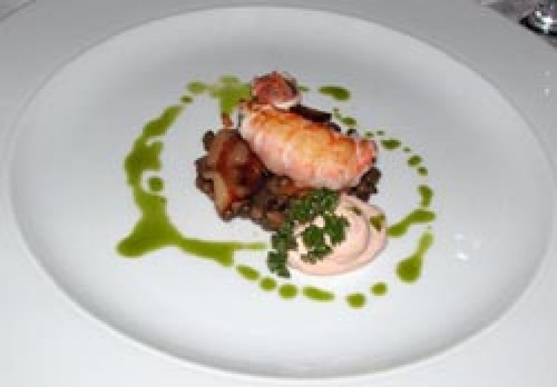 Ensalada Tibia de Lentejas, Cigalas, Panceta Cruijente Y Emulsion de Coral